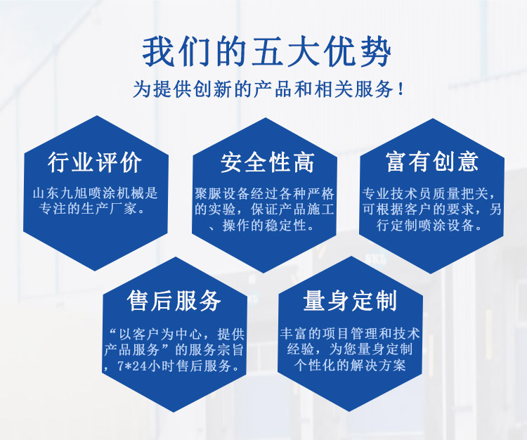 目前山東九旭機(jī)械設(shè)備已領(lǐng)跑中國液壓聚脲設(shè)備行業(yè),價格合理成為廣大客戶之首選。液壓聚脲噴涂機(jī)廠家所銷售產(chǎn)品主要來自國內(nèi)及國際知名品牌,產(chǎn)品性能優(yōu)良,價格合理,專業(yè)的技術(shù)和完善的售后服務(wù)贏得國內(nèi)外眾多客戶的誠摯贊賞........
